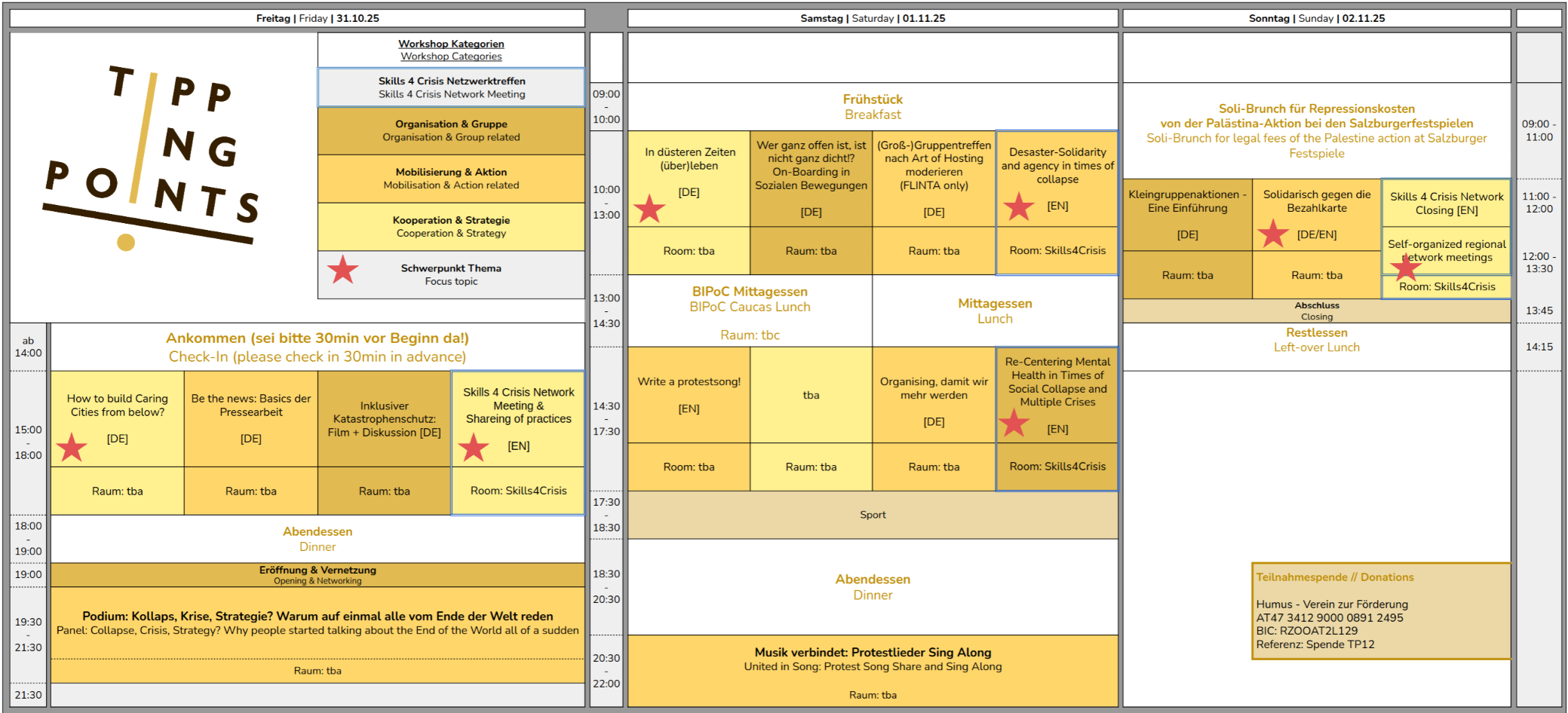 Regardless of whether you come along in October or not, Tipping Points relies on donations from many individuals. If you think our events are good and important, support them with any amount you like. For example, with 50 euros we can enable someone to take part who otherwise couldn't afford it. Find all the details here.